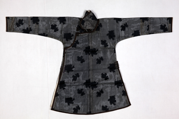 描述:此件女衣立领,大襟,长袖,窄袖口,两侧开衩,下摆略圆。女衣以黑色纱织物为主要面料,有白色衬里。