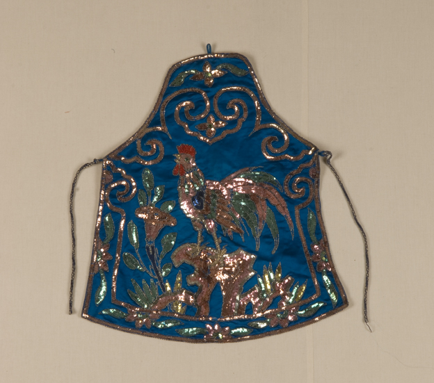 描述:饭单,又称“护胸裙”,在京剧服饰中用作一般劳动妇女的象征性装饰物。此件饭单稍短,以宝蓝色素缎制成,其上用穿珠绣的技法绣出公鸡、山石纹样,上部绣有如意头纹,腰间用两带结于后,以粉红色棉布做衬里。