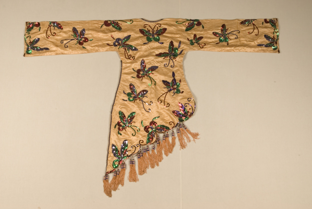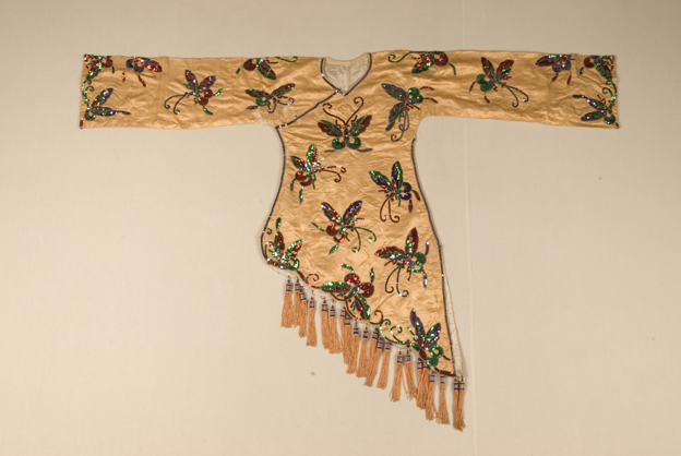 描述:这件女装为圆领、右衽、舒袖、收腰,下摆左长右短,近45度角倾斜,右开衩,并在后摆缀有穗子。通身黄色缎地上用红色、浅紫色、绿色珠片绣蝴蝶,并在领口、襟、开衩处镶有淡紫色珠片。