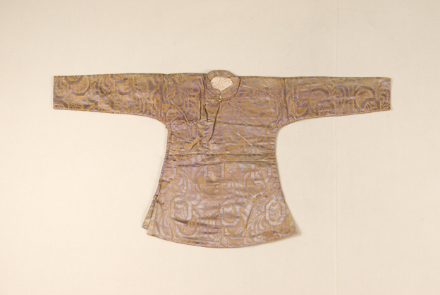 描述:该袄,圆领、右衽,圆下摆,两端开衩。面料为豆黄色大朵花卉纹缎,内有夹绵。印花棉布为衬。采用比较简洁的一字扣。