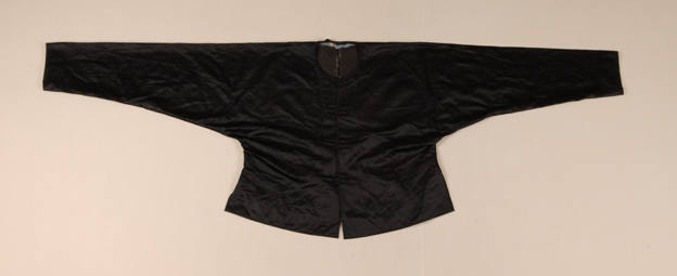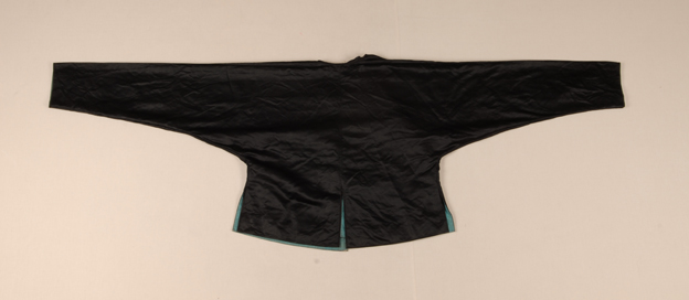 描述:马褂,一般穿在长袍外面。清代,受到广大百姓的崇尚,尤其是商人往往以穿马褂为时髦之标志,《都门杂咏》有这样的诗句:“珍珠袍套属官曹,开禊衣裳势最豪。商贾近来新学得,石青马褂出风毛。” 该马褂,对襟,一字扣。面料为黑色缎。