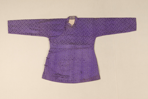 描述:该袄,圆领、右衽,窄袖、圆下摆。面料为紫色小点圆珠纹绸,内有夹绵。采用比较简洁的一字扣。
