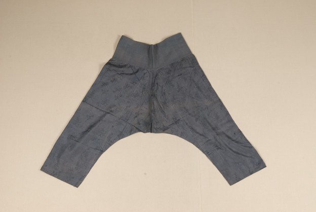 描述:该裤腰部缝有蓝色布料,几乎不分前片和后片,裆较宽大。面料为灰色蝴蝶兰花纹绸,绸料组织为平纹地上起3/1Z斜纹花。蓝色绢作衬。