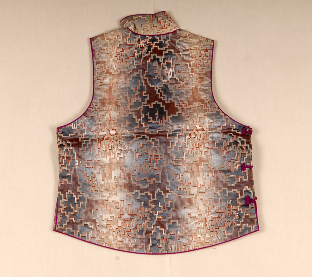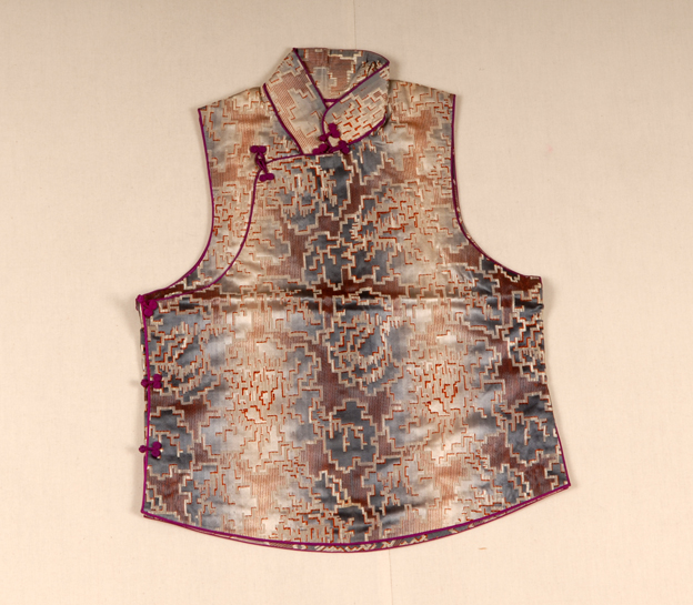 描述:短马甲是南方的称法,在北方常常被称为坎肩,是一种无袖短身的上衣。该短马甲,斜襟,一字扣。面料采用织锦缎,内门襟有一贴袋,粉红色绢作衬。