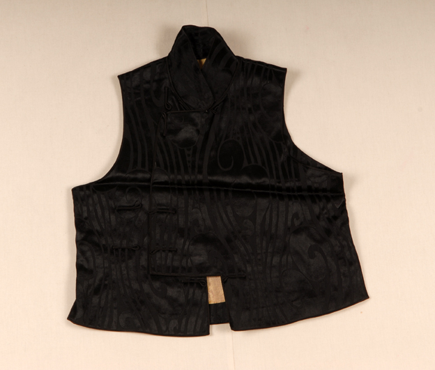 描述:短马甲是南方的称法,在北方常常被称为坎肩,是一种无袖短身的上衣。该短马甲,琵琶襟,一字扣。面料采用黑色织花缎,印花绸作衬。