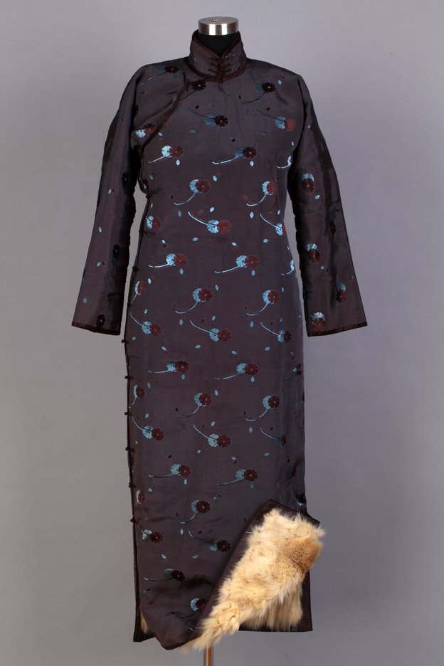 描述:该旗袍,中高立领,长袖,窄袖口,右衽,一字扣。下摆左右两边开衩。面料为织花绸,绸料组织为经浮长起花缎。内衬动物毛。