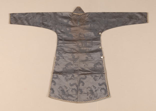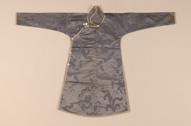 描述:此件女衫立领,大襟,长袖,袖口较窄,衣身较长,两侧开衩。衣身面料为浅灰色暗花缎,使用正反缎组织织成,为花卉图案,花型较大。使用绿色绢做衬里,领口、袖口、下摆及门襟等处用花边缘边。
