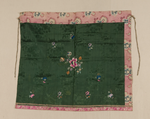 描述:该腰围,长方形。面料主要采用绿色花卉纹绸,其上彩绣散点花卉,所用针法以平针为主。