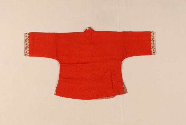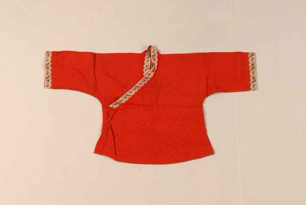 描述:此件为女童所穿之上衣,交领,两侧开衩,衣身较为宽大,以格子纹布做衬里。衣服使用大红色暗花绸为主要面料,其基础组织为平纹地上以1/3左斜纹组织起花,图案为几何纹样。领口与袖口处用花边装饰。