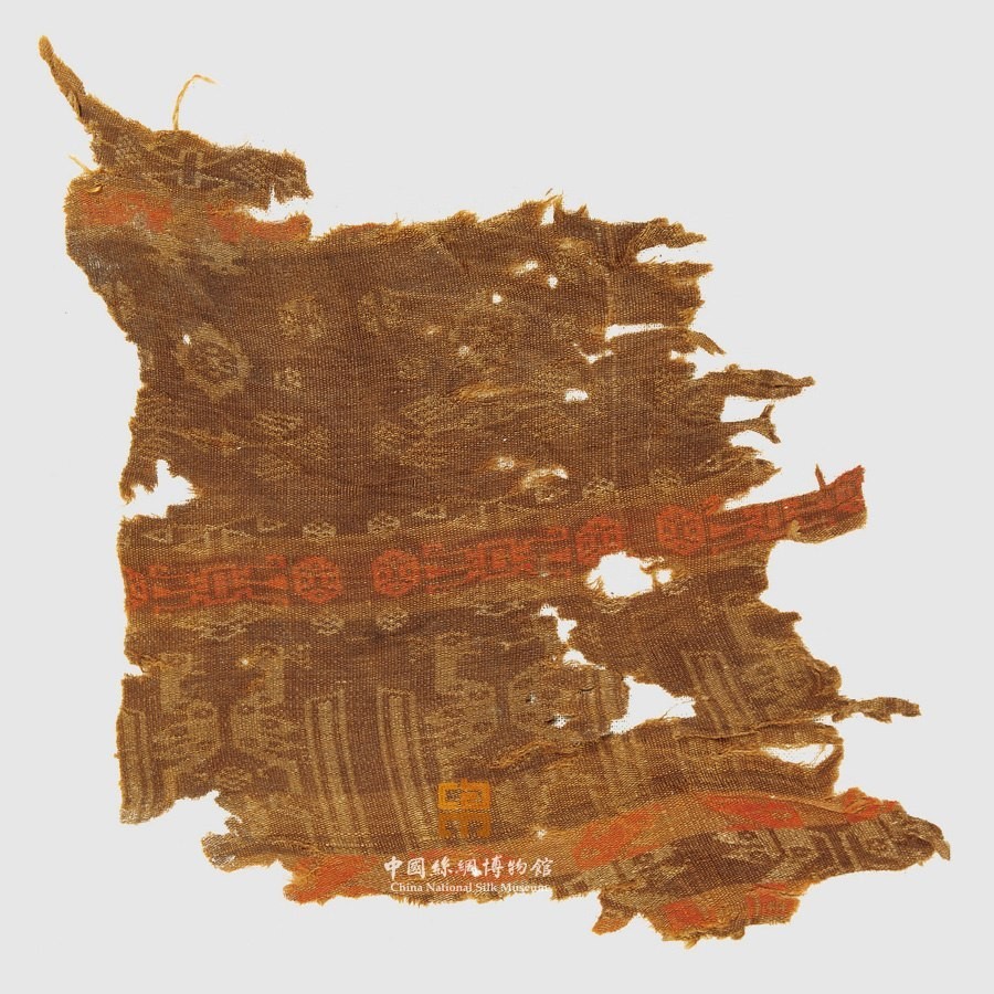 详情:此锦为1:1平纹经重组织,绛红色、棕色、白色分区交替显花,经向循环为4.6cm,纬向循环通幅。从同类完整的织物来看,图案主题为对龙、对凤和对虎纹样,中间穿插各种小型几何纹、杯纹和象征太阳的星纹等。龙、凤、虎都是战国时期织绣图案中最为常见的题材,表现的可能是长江上游、中游和下游不同部落的图腾。其造型虽然显得较为幼稚和古拙,但与湖北江陵马山一号墓中出土的龙凤虎纹绣比较,可以看出其造型的元素是一致的。同类织锦在湖南长沙左家塘战国墓中有相同发现。