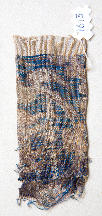 形状内容描述 该残片为一块蓝地云气兽纹锦残片。汉代织锦纹样中以动物纹样为大宗,这从山东嘉祥宋山汉画石刻铭文中就可见一斑:"交龙委蛇,猛虎延视,玄猿登高,狮熊嗥戏,众兽群骤,万兽云布。"