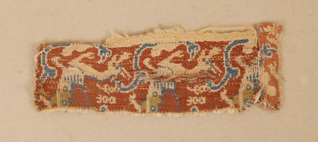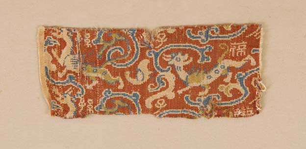 汉代经锦是汉代最高水平的丝织物,采用二重平纹组织,称为“经锦”。该组汉锦共有两件,色彩保存完好,纹样具有典型的汉代织锦特点,在云气纹中夹织有“长葆子孙”隶书吉祥文字。 云气动物锦中织入这类铭文就像是给神山仙境配注了文字,把当时人们渴望得道升仙荫及子孙的理念表达得十分充分。