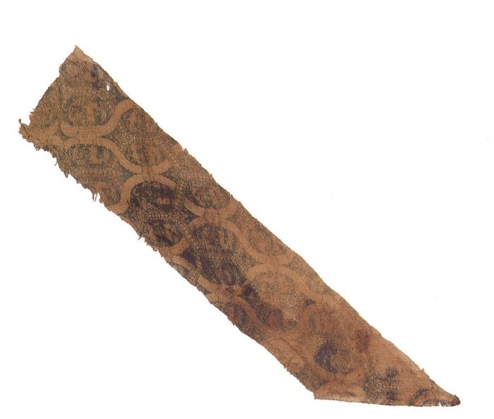 简介:织物为1:1平纹经锦,以蓝色和白色两色经线织成,经向循环为9cm,纬向循环为13cm。其图案骨架比较别致,由对波形(S形)骨架和六边形龟背骨架交错构成,其中对波形骨架由一层联珠和一层卷云组成,而六边形骨架由中间联珠及左右对称的卷云纹样组成,这两种骨架在连接处均以八瓣小花作纽。在骨架之中的动物分为两行,一行中有对鹿和对狮图案,另一行中则为对鹿和对凤纹样。这种六边形和弧线形交错构成的骨架在敦煌莫高窟出土北魏时期刺绣中有相似发现,其一鹿一凤、一鹿一狮的配置也与敦煌藏经洞所出龙凤虎纹锦中的一龙一凤、一龙一虎的排列有类似之处。
