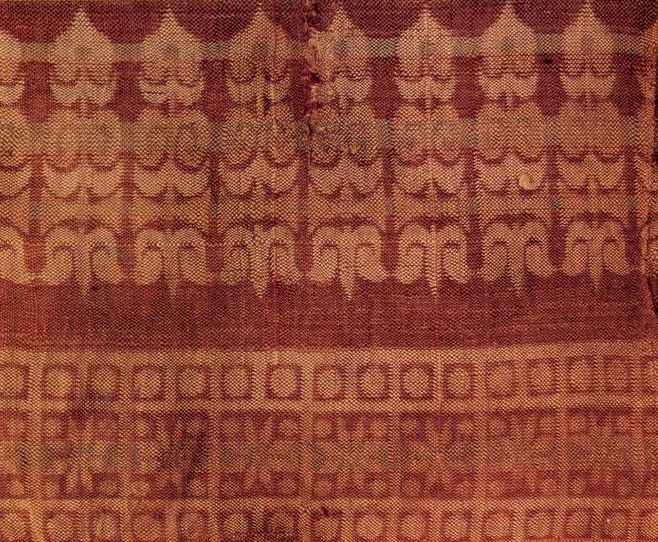 此为平纹纬锦,深褐色地上以浅褐色纬线显花,局部织入绿色纬线。上下各有一条装饰带,其内装饰有联珠、六瓣小花纹样,装饰带之间则是树纹图案。
