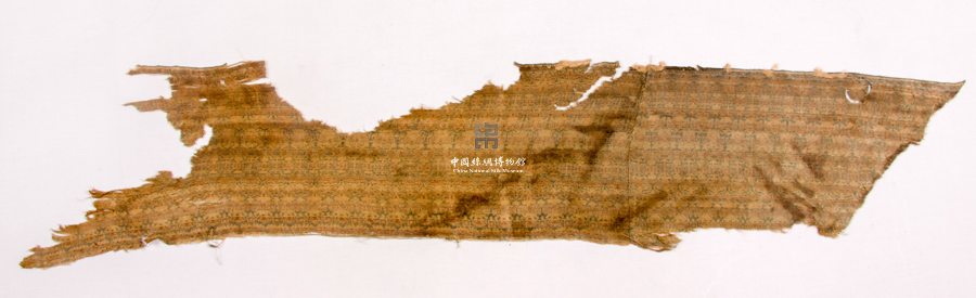 形状内容描述 此件为经锦织物,以经重组织织造,在深褐色地上以蓝绿等丝线显花。织物较为残缺,表面呈条形图案,其上装饰有几何花卉纹样。