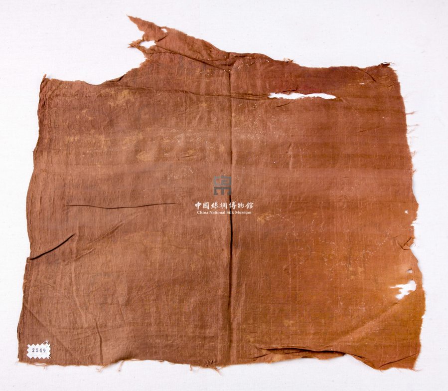 形状内容描述 此件黄褐色绢为方形,单层。其基本结构为一上一下平纹组织,无提花。质地轻薄,柔软。组织间的经纬密度较大,组织结构较为疏松。有破损。疑为某件服装中的某个部件。