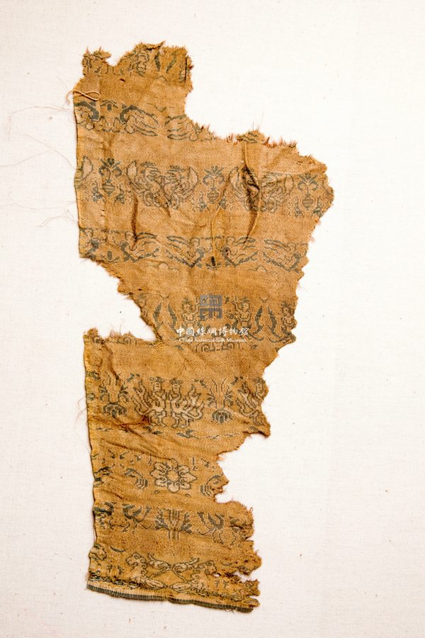 形状内容描述 该织物残片为一块对鸟对兽人物花卉纹锦。对鸟对兽纹是魏晋南北朝时期常见的一种排列方式。这一时期,虽然政局动荡,但南北文化交流发展,西方特色的纹样传入中国。