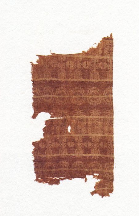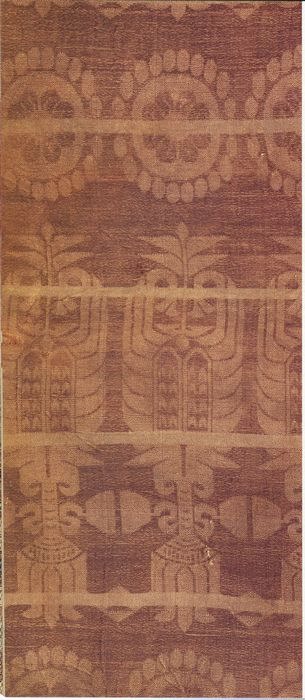 此块平纹纬锦以生命树图案作为主要表现题材,其间装饰有联珠小团花,具有较强的中亚风格。