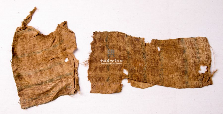 形状内容描述 该件织物征集自青海民间,褪色及破损情况较为严重,其原来的图案不可知,隐约可见条格形图案,内有小花纹。为经线起花组织,可见褐色、绿色经线,是一件经锦织物。