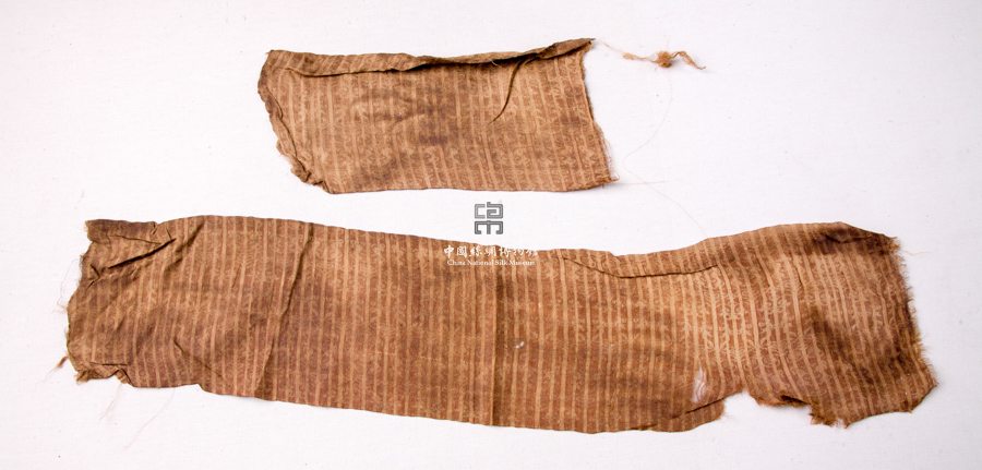 形状内容描述 该件织物共有两块,均以褐色作地,以黄色织出条纹纹样。织物为经线起花,是典型的经锦。