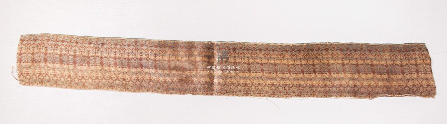 形状内容描述 该锦色彩保存较好,呈长条状,有幅边。织物为1:2平纹经重组织,以红褐色为地,蓝、绿、黄色丝线起花,图案呈直条形,一条小花纹,一条兽纹相间排列,兽纹有几种,因织物较窄图案横向循环不全,能看到的只有奔鹿纹,鹿的头上有长角,还有上下左右相对的四个兽纹,其昂首挺胸站立着,两臂挥舞,尾巴上翘,非常威武。这类图案呈长条状的经锦在北朝较为典型。