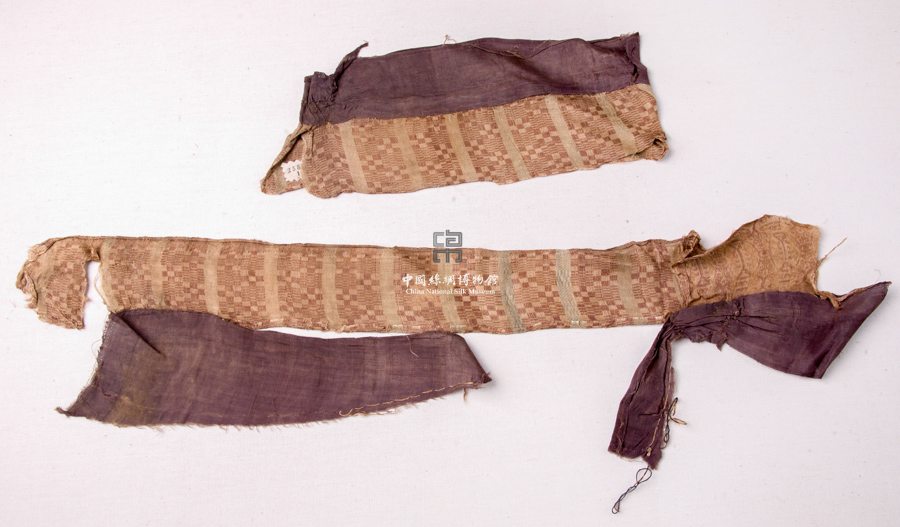 形状内容描述 该件织锦征集自青海民间,共有三块,均呈狭长形。织物以褐色为地,其上用浅褐色起条形及菱格形图案,具有较强的几何意味。