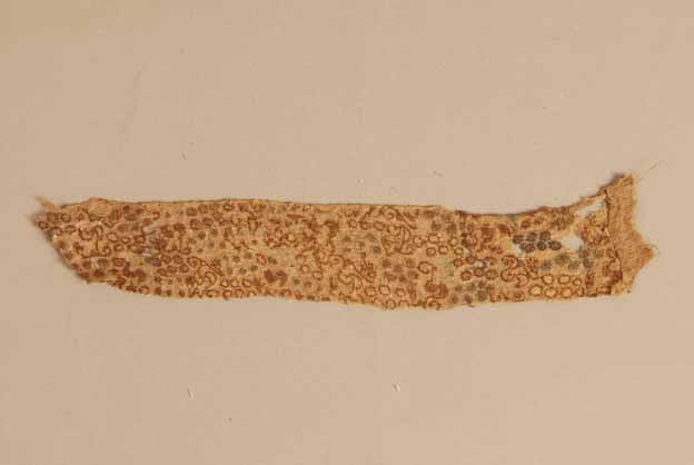 长方形绣片。左侧可见缘边,已破损,下端是幅边,绣线棕色为主,此外还有浅棕、蓝绿(左端,中间有褪色)和黄色,上绣小圆圈,局部可见卷曲纹。上端向内折,用缝线固定。