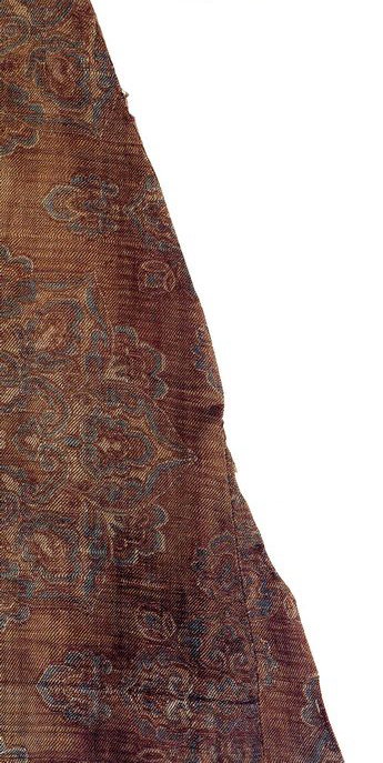 宝花图案在许多出土实物及敦煌壁画中都可看到,唐代的宝花纹样大体可分为四种,一是瓣形宝花,二是装饰性很强的蕾式宝花,三是写生味较强的侧式宝花,四是常有鸟鹊蜂蝶绕飞的景象宝花。此件宝花纹锦属于蕾式宝花,是盛唐时期宝花的典型代表。