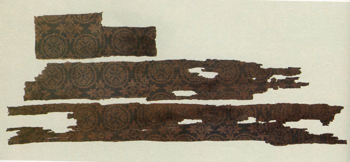 小花图案在隋到初唐时十分流行,在敦煌壁画或西安等地隋至唐初墓所出彩塑中亦多有描绘。其种类有联珠环小团花、类似菊花的小团花,变化相当丰富。此件织物的纹样是联珠环小团花,其间装饰有菱形状的宾花。