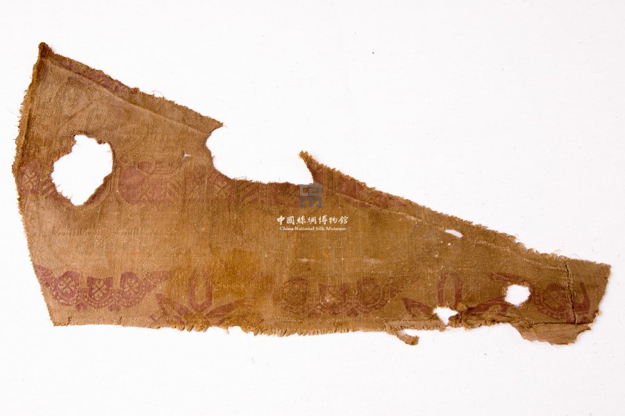 形状内容描述 该件是一件传统纬锦织物,征集自青海民间。织物较为残破,只可看到它的主要图案是团窠纹,窠内采用了两只相对而立的大鸟,这种类似的题材在同一时期的出土织物上也有发现。