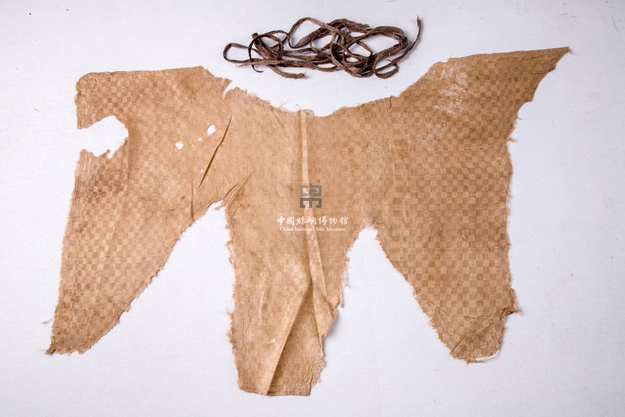 形状内容描述 该件黄色,图案为方格纹,方格大0.8cm,图案循环经向和纬向相同,均为1.6cm。织物组织结构是1/1平纹地上起变化斜纹花的绮。这类织物在唐代非常流行,在西北地区出土的纺织品中较多见。