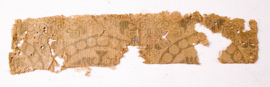 形状内容描述 此是一件斜纹纬锦织物,地部为黄色,其上以蓝色丝线织出联珠团窠纹样。联珠团窠是唐代丝绸图案中一种常见的排列形式,主要是指一种由环状纹样带形成的圆形区域中设置主题纹样的形式,这类主题纹样多为动物。