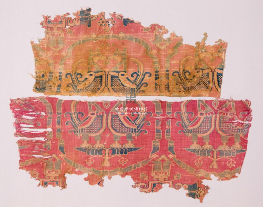 形状内容描述 该件织物共有两片,从青海民间征集而来,以深红色为地,采用1:2斜纹纬重组织,经线加有极强的Z捻,纬线以深红色为地,用浅黄、深蓝、灰绿三色/显花,具有典型的中亚粟特风格,其图案中心是一个圆形的联珠纹样,中间有两只鸟相对而立,尾巴呈卷草状上翘,双足站于花台之上。团窠之外是对称的十样花作宾花。