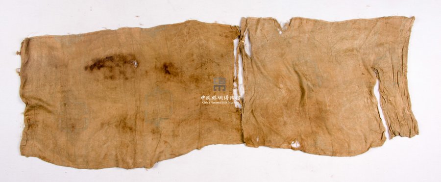形状内容描述 该件织物为一件纬锦,较为残破,共有两片,褪色严重。织物以黄色为地,以绿色丝线织出宝花纹样。宝花是一种综合了各种花卉因素的想象性图案,它叶中有花,花中有叶,虚实结合,正侧相叠。取材中有来自印度的莲花形象,又有来自地中海的忍冬和卷草纹样。