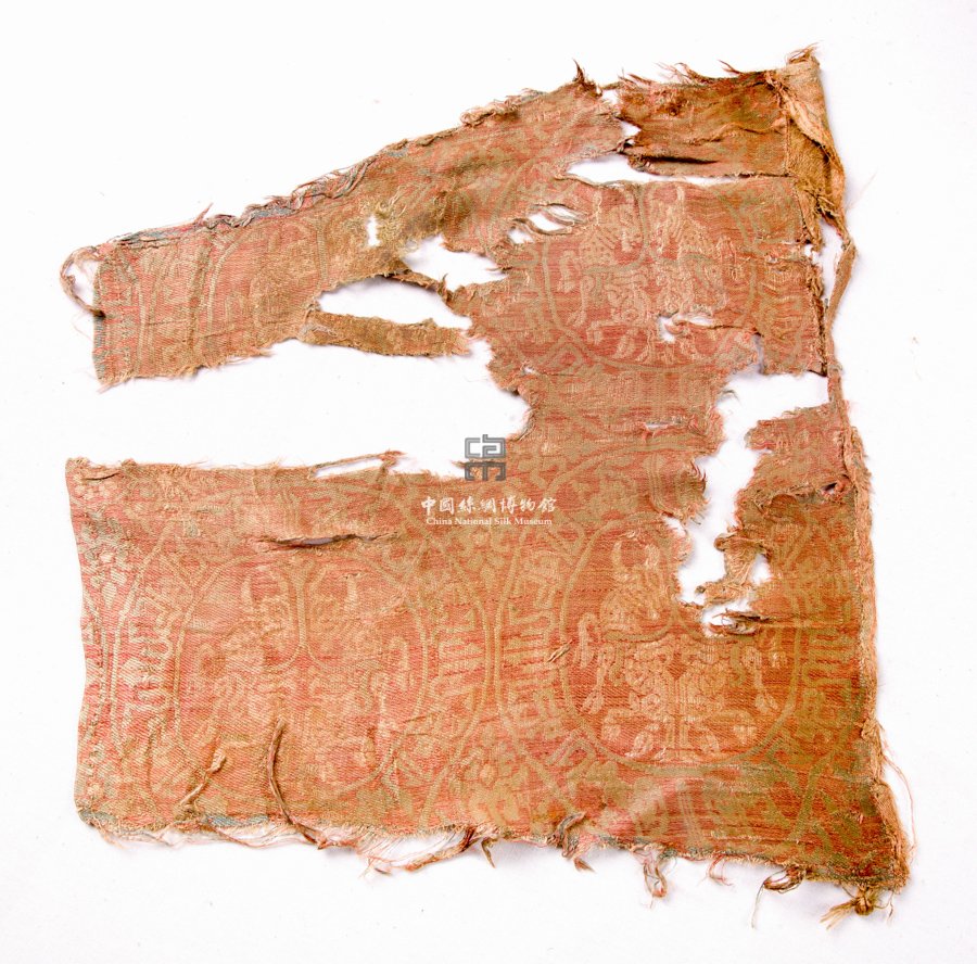 形状内容描述 该件织物为一件纬锦,较为残破,共有两片。织物以红色为地,以团窠作为图案的基本骨架,在团窠中织有两只牛形的动物纹样,较为特殊的是,在团窠中织有一些可能是阿拉伯文的异样文。