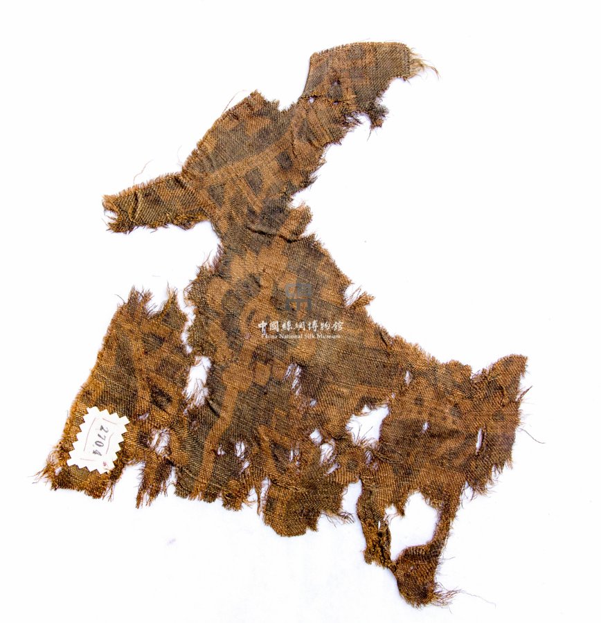 形状内容描述 该件为唐代斜纹纬锦,图案虽然不全,但能看出是联珠对鸟纹,宾花为小团花。
