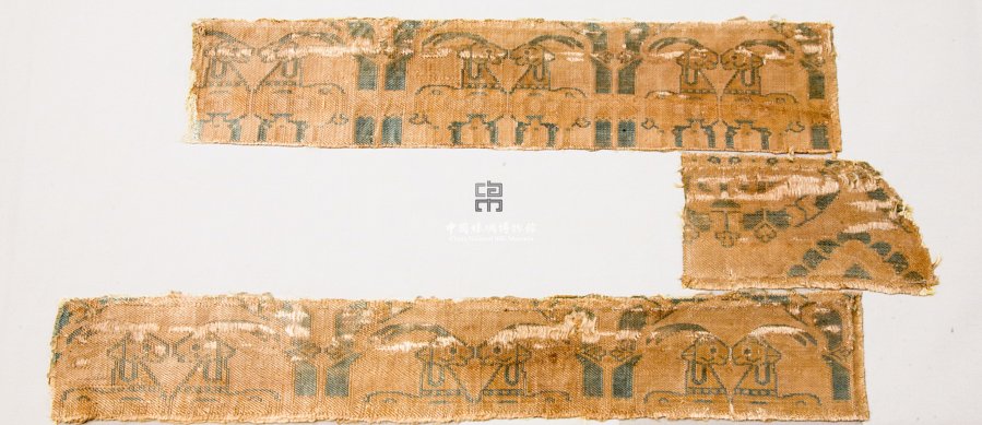 形状内容描述 该件有两条织锦拼接而成,为斜纹纬重组织,主体图案是团窠对鹿,鹿角长而无叉角,体态肥硕,昂首挺胸相对而立,构图相当规正,与丝绸之路沿途出土的动物纹唐代纬锦风格类同。