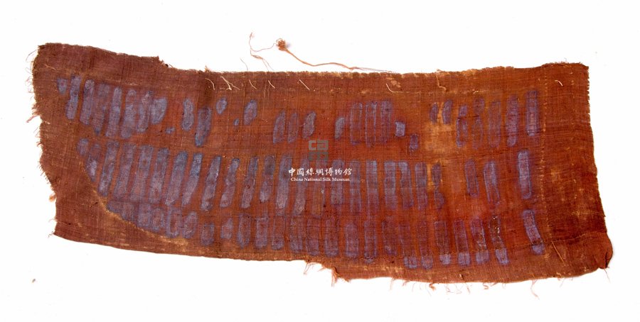 形状内容描述 该件织物呈长方形,四周有缝线痕迹,可能是从某件袍服或其他物件上拆下来的,其织物组织结构为1/1平纹绢,丝线较粗。在绢上有黑色的较有规律但不完全相同的小长条印痕,似用某种材料画绘过,具体是画绘所用的材料有待于检测。