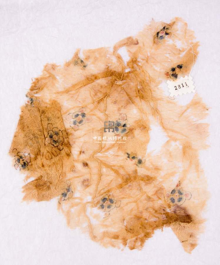形状内容描述 此件为彩绘织物,以素罗为绘地,其上以蓝、红等各色颜料画出小型花卉纹样。花卉由两重四瓣花构成,并可见以墨笔描绘的轮廓。