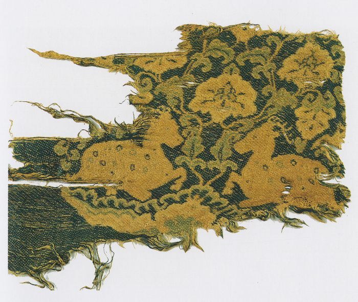 详情:此件织物以蓝色为地,在它纹样的中轴线处为二直立生长的莲花,开得非常饱满。在大莲花的两侧又各长出几片卷曲的叶片以及几朵小莲花,蜿蜒曲折,错落有致,围出了整个图案滴珠状的外形。莲花树下,两只鹿相对而卧,他们身上长有斑点,可能是梅花鹿之类,鹿首微昂,前足微微抬起,似欲扬蹄而起。织物组织为辽式缎纹纬锦,经线两组,纬线四组,分别为蓝色、浅黄色、土黄色和白色显花。残留的对鹿图案,经向残高12cm,纬向大小应为15cm。