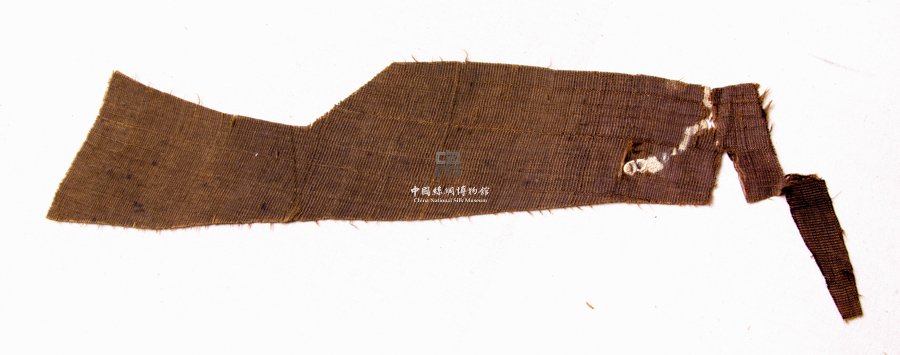 形状内容描述 此为一件残片,呈酱色,织物以1/1平纹组织织成,纬线采用一纬粗一纬细织入,使织物表面显现出特殊的机理效果。