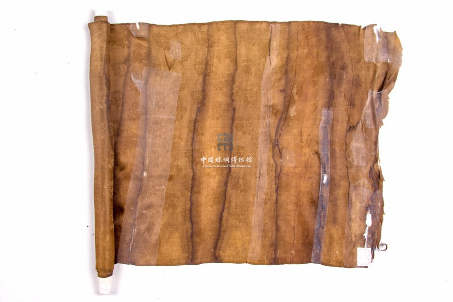 形状内容描述 此件织物为匹料,有几处破损,部分位置曾使用丝网进行加固。其基础组织为3/1右斜纹地上起1/5左斜纹花,为异向绫,花地清晰,以折枝花卉为主要表现题材。