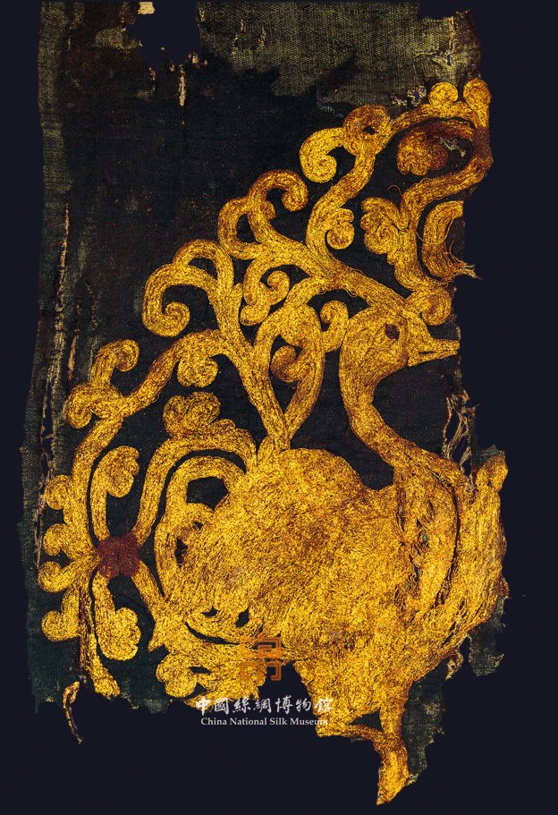 详情:这应该属于一件大型罗袍的残片,以黑色通体绞素罗为地,用纯赤金线盘金绣出图案。图案为团窠卷草对雁纹,卷草环的造型由四个卷草主体组成,中心呈盘绦状,并向两边散开,卷草之间再相互纠绞,形成通体地缠绕。团窠中间是一对大雁,单足伫立,翅膀略展,昂首挺胸,欲衔绶带。这类团窠对雁自唐代起已成为高官的专用服饰标志,在辽代也是如此。墓主人耶律羽之曾为辽代东丹国相,官至一品,正可以服用此类图案。