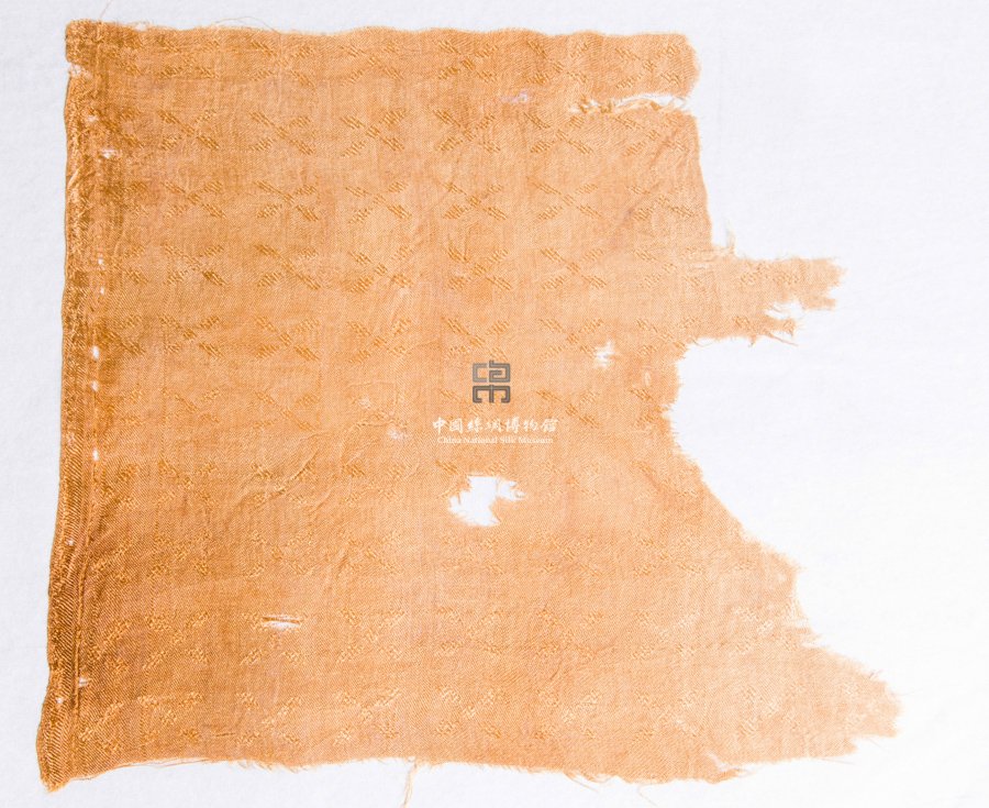 形状内容描述 该残片为一黄色十字花纹绫。主题纹样按经线和纬线严格排列,即二二正排。