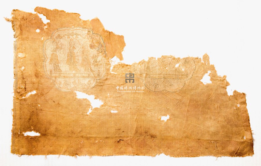 形状内容描述 该织物为一妆花绫残片,纹样为黄地瓣窠人物纹。妆花是对挖梭工艺的别称,通过运用通经断纬的技术来起花。可根据地部组织的不同称之为妆花绫、妆花罗、妆花绢等。
