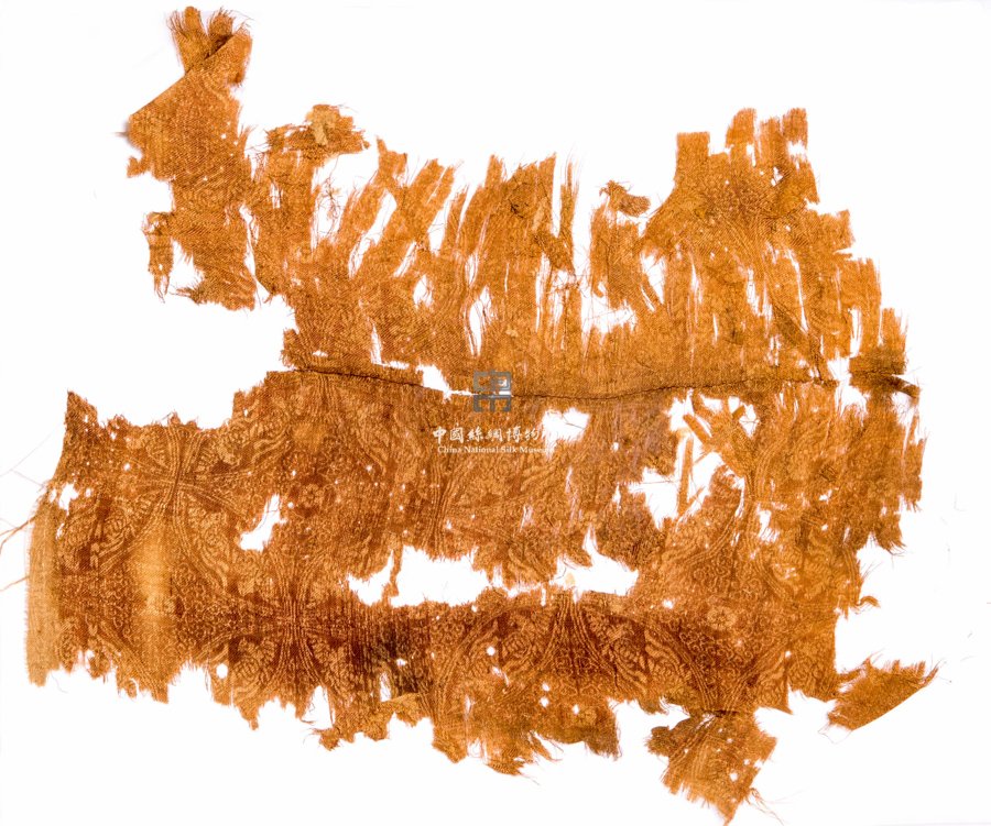 形状内容描述 此件为当时标准的1/2S辽式斜纹纬锦织物,但纬线颜色较少,只有黄和浅褐两种,其整幅图案由四圆相交的骨架构成,可称为球路纹,在圆圆相交而形成的各小区域内,各有两只凤鸟在飞翔,而在其中心区域内则是呈十字对称的花卉纹样,其图案循环经向为16.5cm,纬向为14厘米。
