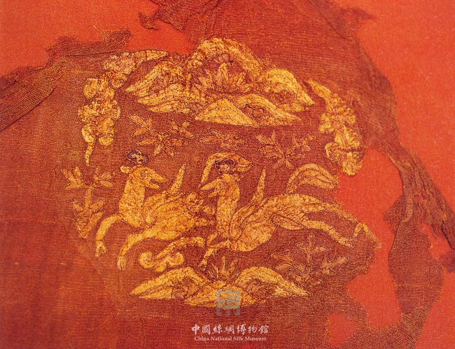 详情:此件绣品以四经绞素罗为地,用压金彩绣的方法刺绣出图案,即以单根金线钉金压边,用平绣针法绣出主体纹样。图案是一团窠,上为树林,树林两旁各有两朵飘动的云气,中间是两只奔鹿,一鹿向前,一鹿回头,头戴灵芝花冠,身长翅膀,下方为山石和花草,图案极富有动感。这件绣品出自耶律羽之墓,反映的是契丹人秋林之中鹿鸣于野的场面,应与当时的秋山图案有关。