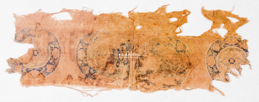 形状内容描述 此织物组织为三枚右斜纹纬锦。以团窠为主纹,团窠直径为12cm,并以二二正排形式排列。窠内最里层为小宝花纹,外有四只飞雁衔花枝,围绕宝花对称旋转,此类图案与辽墓出土的卷云四雁衔花枝绫十分相似。团窠最外层是深蓝色缠枝花卉。整个图案布局简洁,图案灵动精美。