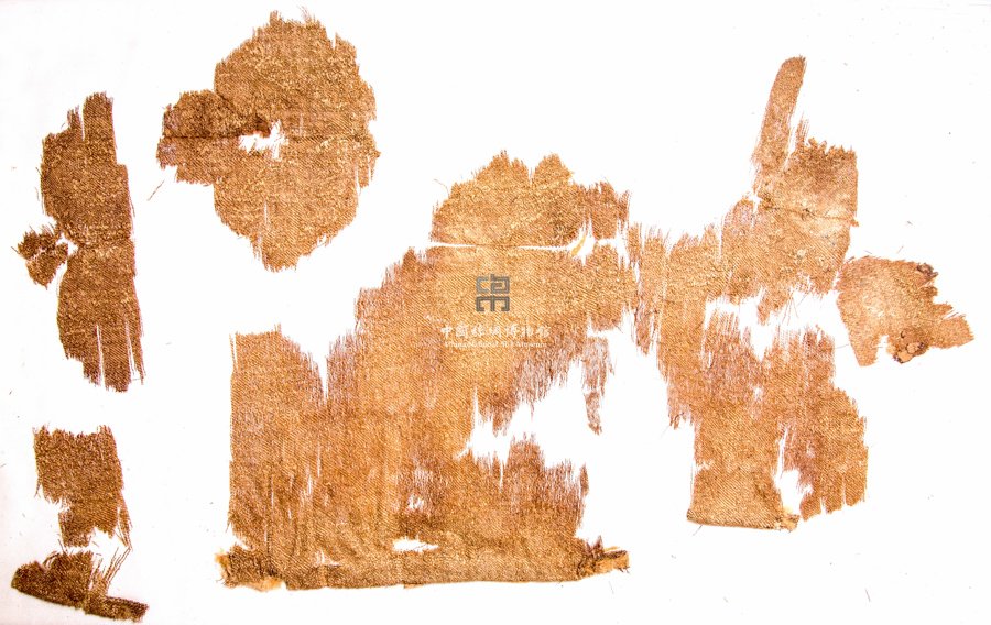 形状内容描述 此件织物已碎成多块,是一件较为典型的辽式浮纹纬锦,在织造时每套纹纬中起码有一根纹纬作为地部,而余下的纹纬就以浮长的形式在织物表面显花,而在其反面,所有的纹纬均一起织入形成纬面效果。此件织物的丝线现均以褪色,主题图案及颜色均难以辨认。