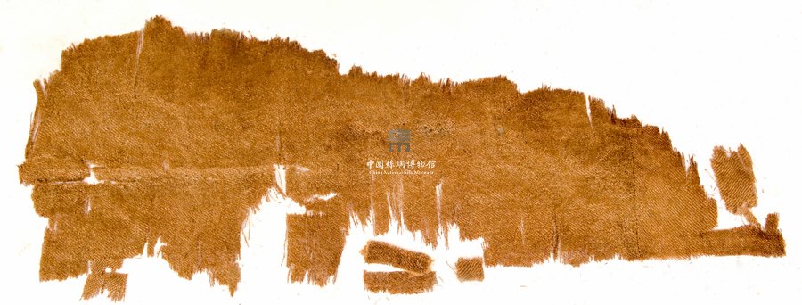 形状内容描述 此件织物较为残破,是一件较为典型的辽式浮纹纬锦,在织造时每套纹纬中起码有一根纹纬作为地部,而余下的纹纬就以浮长的形式在织物表面显花,而在其反面,所有的纹纬均一起织入形成纬面效果。此件织物的丝线现均以褪色,主题图案及颜色均难以辨认,可能是宝花状的团窠图案。